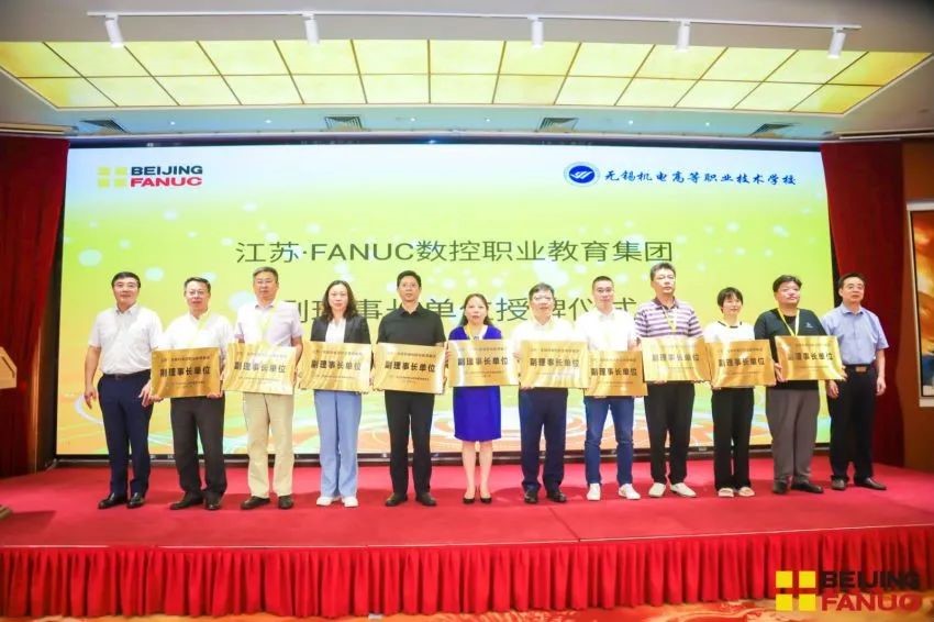 江苏联合职业技术学院党委书记刘克勇和江苏•FANUC数控职业教育集团理事长、37000威尼斯总经理景喜瑞为无锡机电高等职业技术学校、纽威数控装备(苏州)股份有限公司等新一届的副理事长单位(16家)授牌。